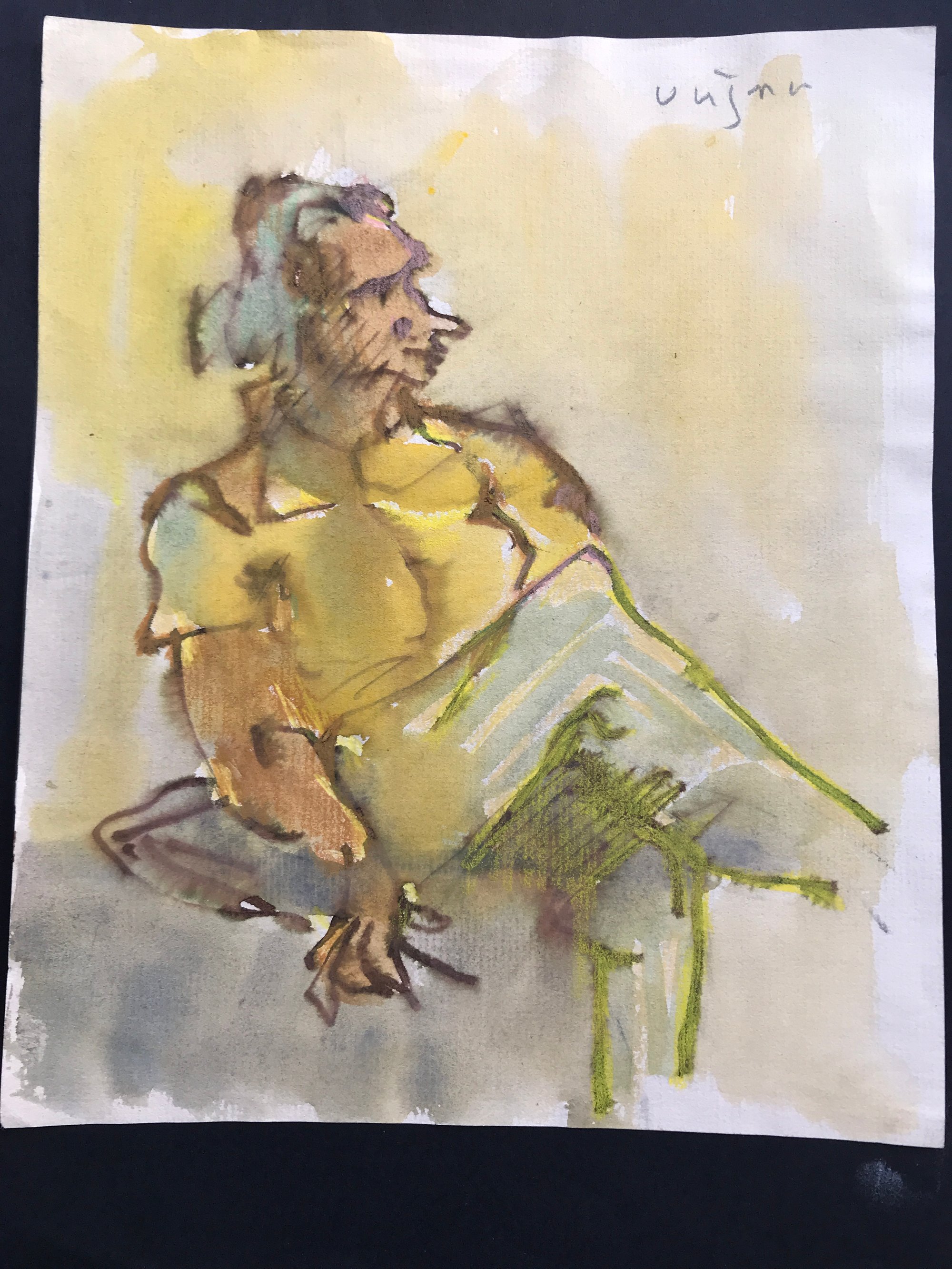 “Gladys” (9 5/16 x 7 11/16”) was a visitor during one of Hank’s Open Studio events. She just sat on the sofa/bed to take a rest while admiring Hank’s work. Hank decided to quickly paint a gesture as he conversed with other guests. He raised his head and saw she was gone; he was sad she left as he wanted her to have this painting. Gladys, where are you? Watercolor. Ink. Signed and Unframed.